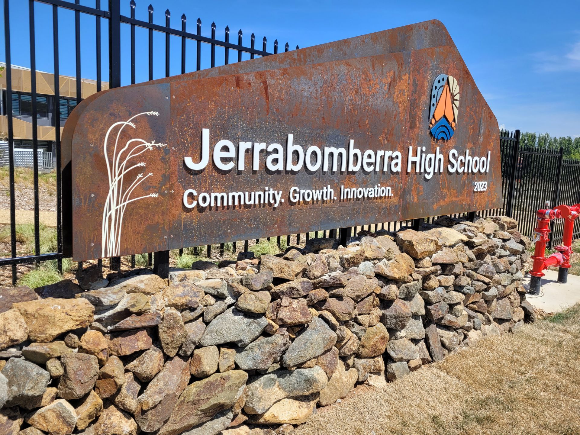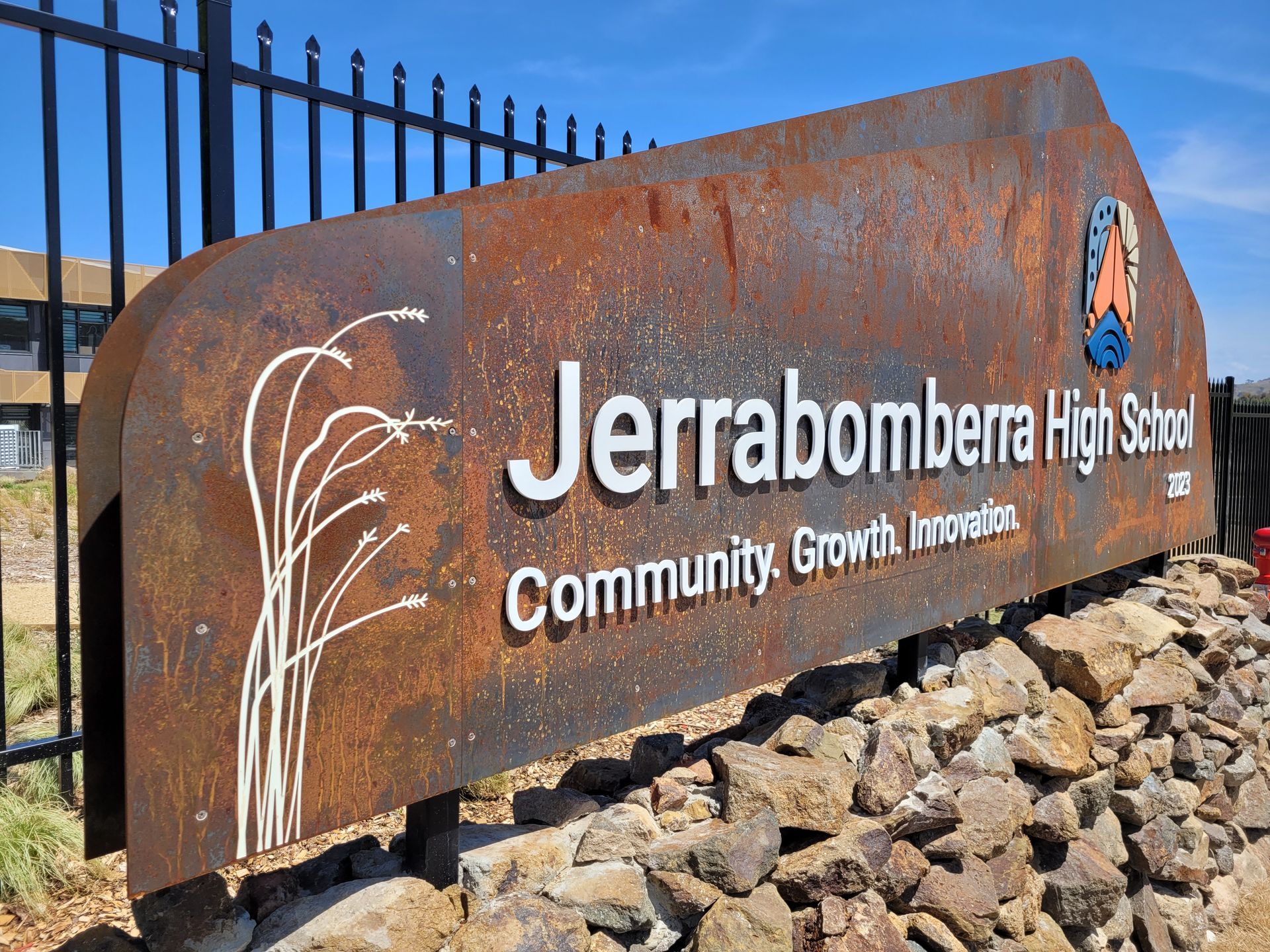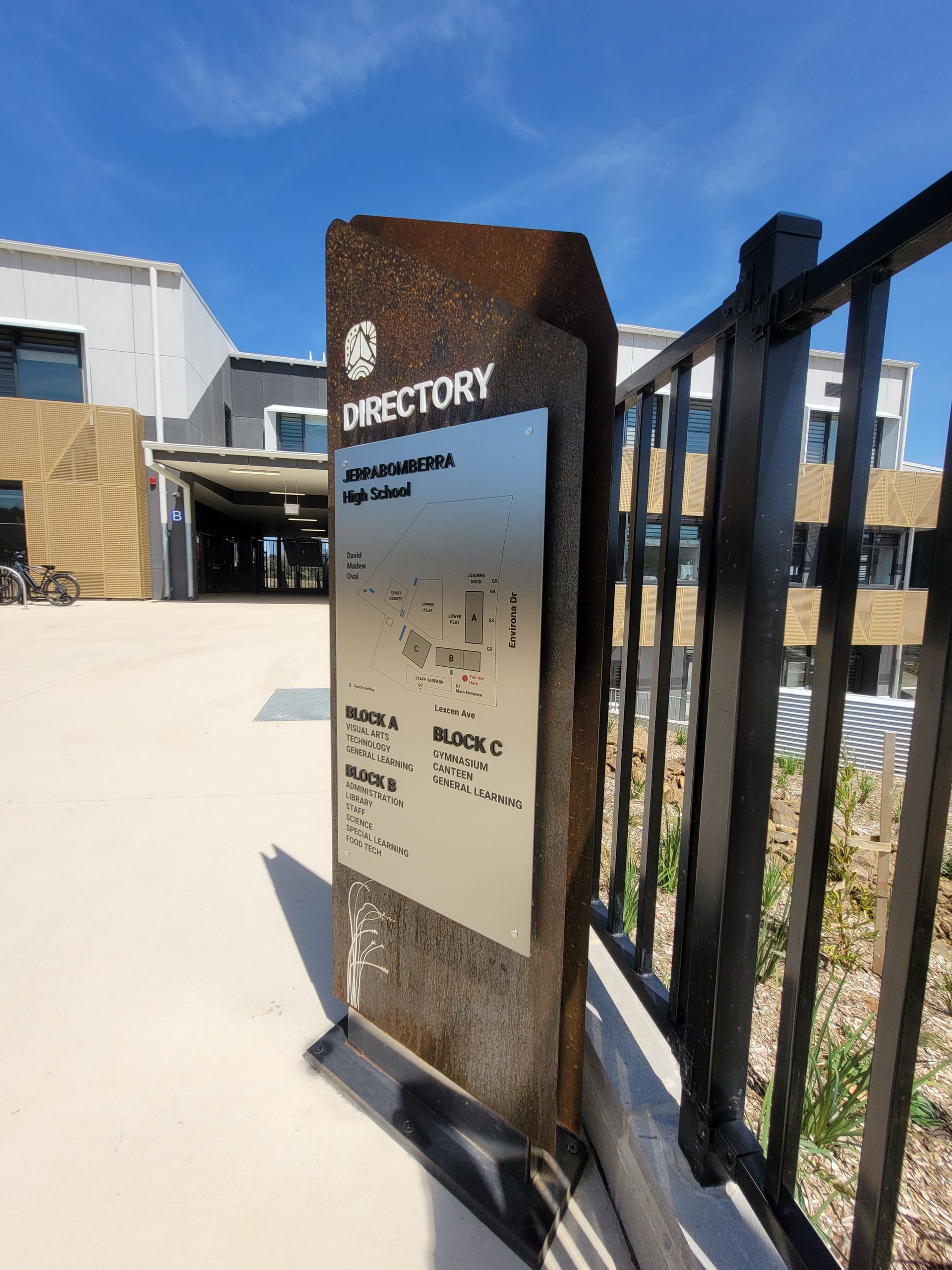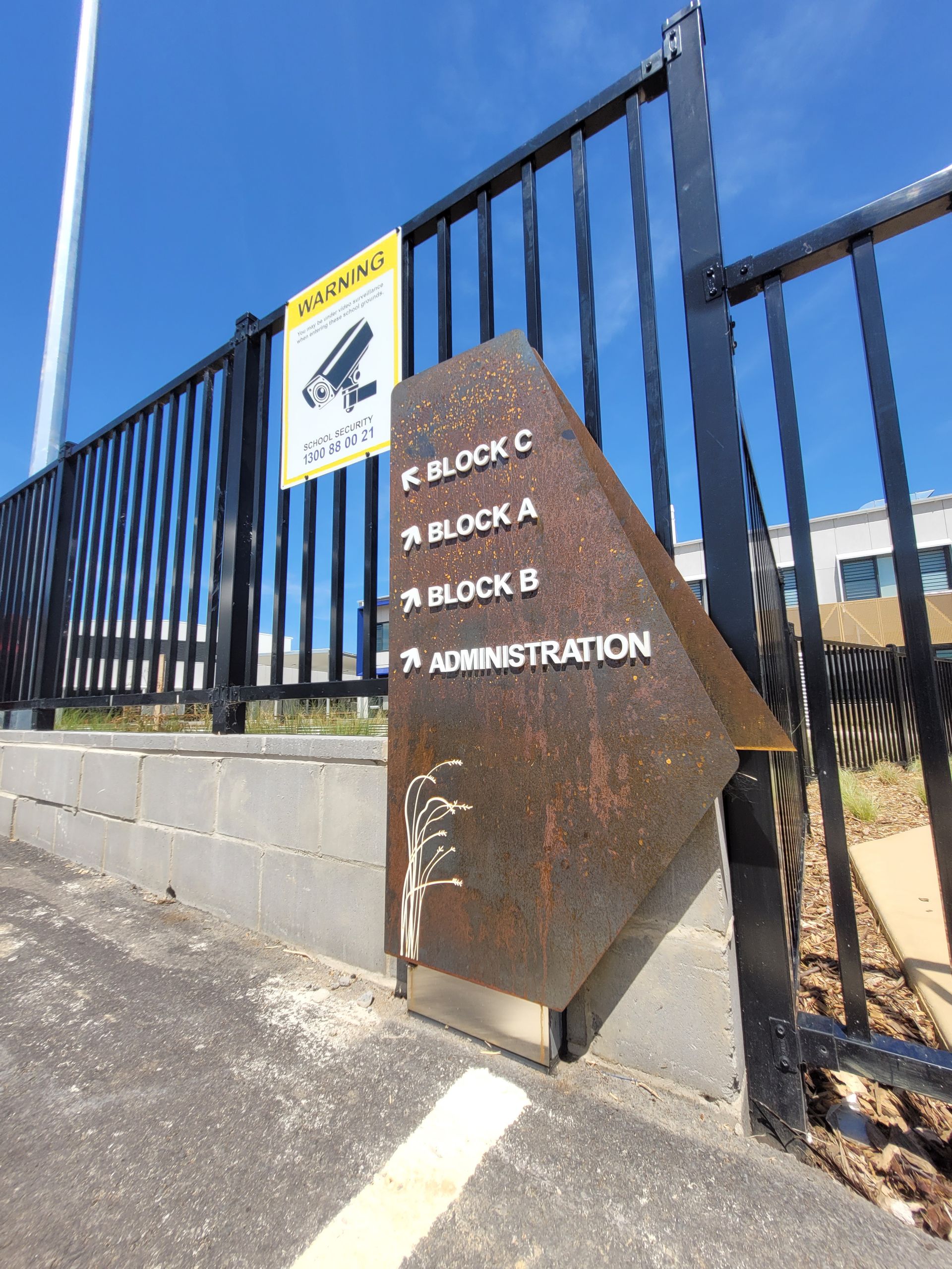 With the growing community in the Jerrabomberra region, Hindmarsh Constructions where tasked to construct a new High School by the NSW Government. Signworks were engaged to design, fabricate and install the signage package for the project. The stand out signage is the wayfinding and main entry feature sign which included the use of corten steel.